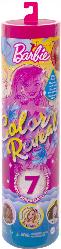 Barbie® Color Reveal™ dolls deliver unboxing surprises! A doll wearing a trendy fashion is guaranteed, but each doll's look remains a mystery until revealed. The packaging is part of the fun -- pull the strip to remove the outer layer and reveal a clear tube. Inside is a confetti-printed Color Reveal™ doll and multiple mystery bags hiding six more surprises within. Remove them all and fill the tube with warm water, then insert the doll and swirl her around. The water makes it look like the confetti is falling, and when the doll is pulled out, her features are revealed! Each doll has a different combination of eye color, rooted color-change hair, skin tone, lip color, opaque glitter legs and decorated leotard, but the surprises continue…open the bags to discover a double-sided hair brush and sponge, a pair of earrings, a skirt and a pair of shoes. Use ice cold water to transform the doll's hair and bodice. With the use of warm and ice cold water, kids can repeat this wow moment over and over again! Dress the doll up and play out a story. Each series has a unique theme -- these Color Reveal™ dolls are party-themed with glitter-molded legs and a celebratory apparel. Use the
