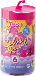 Barbie® Chelsea™ Color Reveal™ dolls deliver unboxing surprises! A doll wearing a trendy fashion is guaranteed, but each doll's look remains a mystery until revealed. The packaging is part of the fun -- pull the strip to remove the outer layer and reveal a clear tube. Inside is a mystery marble purple Chelsea™ Color Reveal™ doll and six additional surprises within. Remove them all and fill the tube with warm water, then insert the doll and swirl her around. The water turns pastel purple, and when the doll is pulled out, her features are revealed! Each doll has a different combination of color-change molded hair, skin tone and decorated swimsuit, but the surprises continue…open the bags to discover a cover-up or sarong, shoes, terrycloth-printed towel and beach-going accessory. Use cold water to transform the doll's hair and bodice. With the use of warm and ice cold water, kids can repeat this wow moment over and over again! Dress the doll up and play out a story. Each series has a unique theme – these Chelsea™ Color Reveal™ dolls are ready for the sand and sun with their beach attire and accessories. Use the tube to store the Chelsea™ doll and fun surprises. Kids can coll